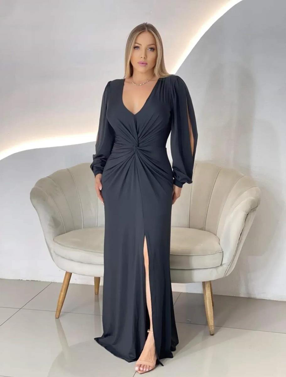 Vestido Longo em Poliamida com Nó Frontal – Manga Longa | Tamanho Único (Veste até o 46)