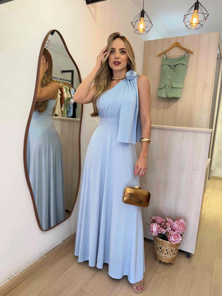 Vestido longo em poliamida fluide, com caimento impecável e modelo ombro só, trazendo sofisticação e feminilidade. O destaque fica para o detalhe de flor aplicada, que valoriza ainda mais a peça, tornando-a única e memorável. Possui forro completo, garantindo conforto e segurança ao vestir.